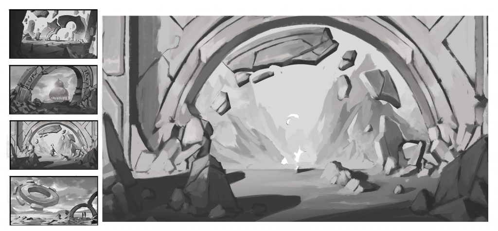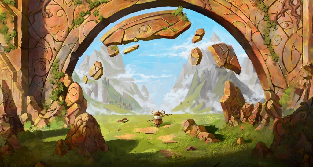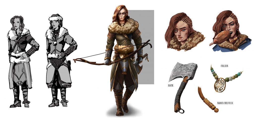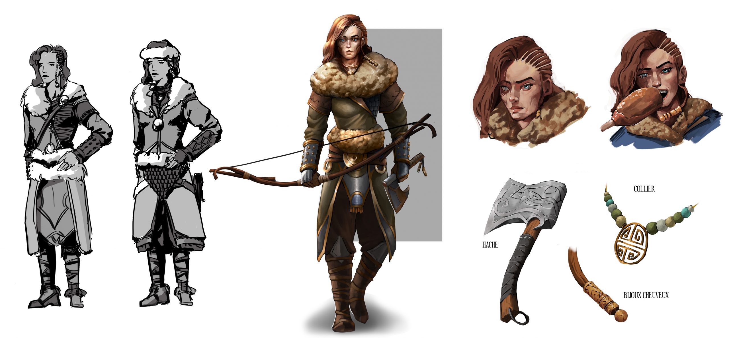 Concept Art d’un personnage vivant dans un environnement montagneux.