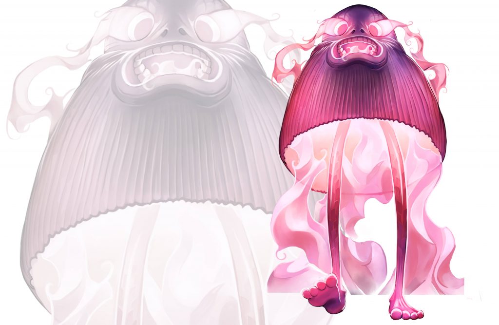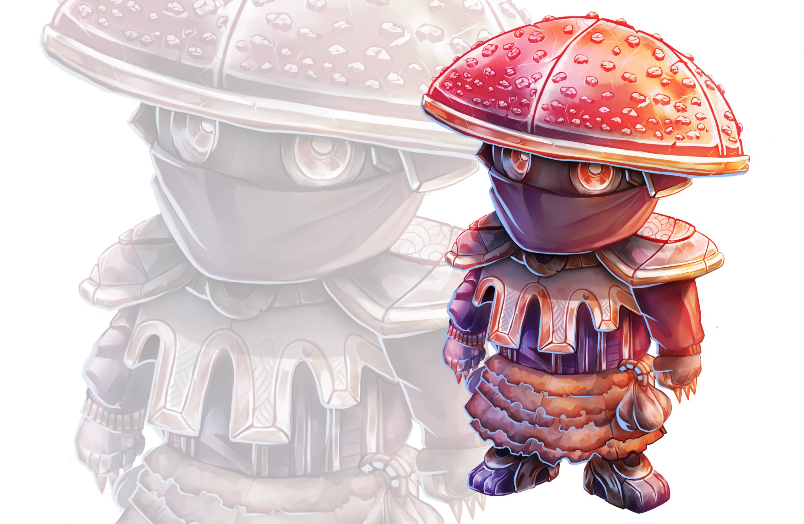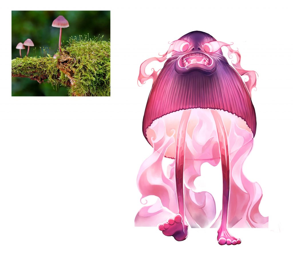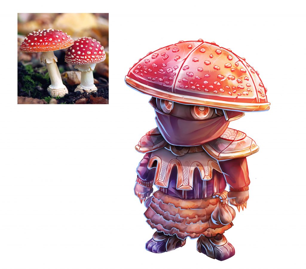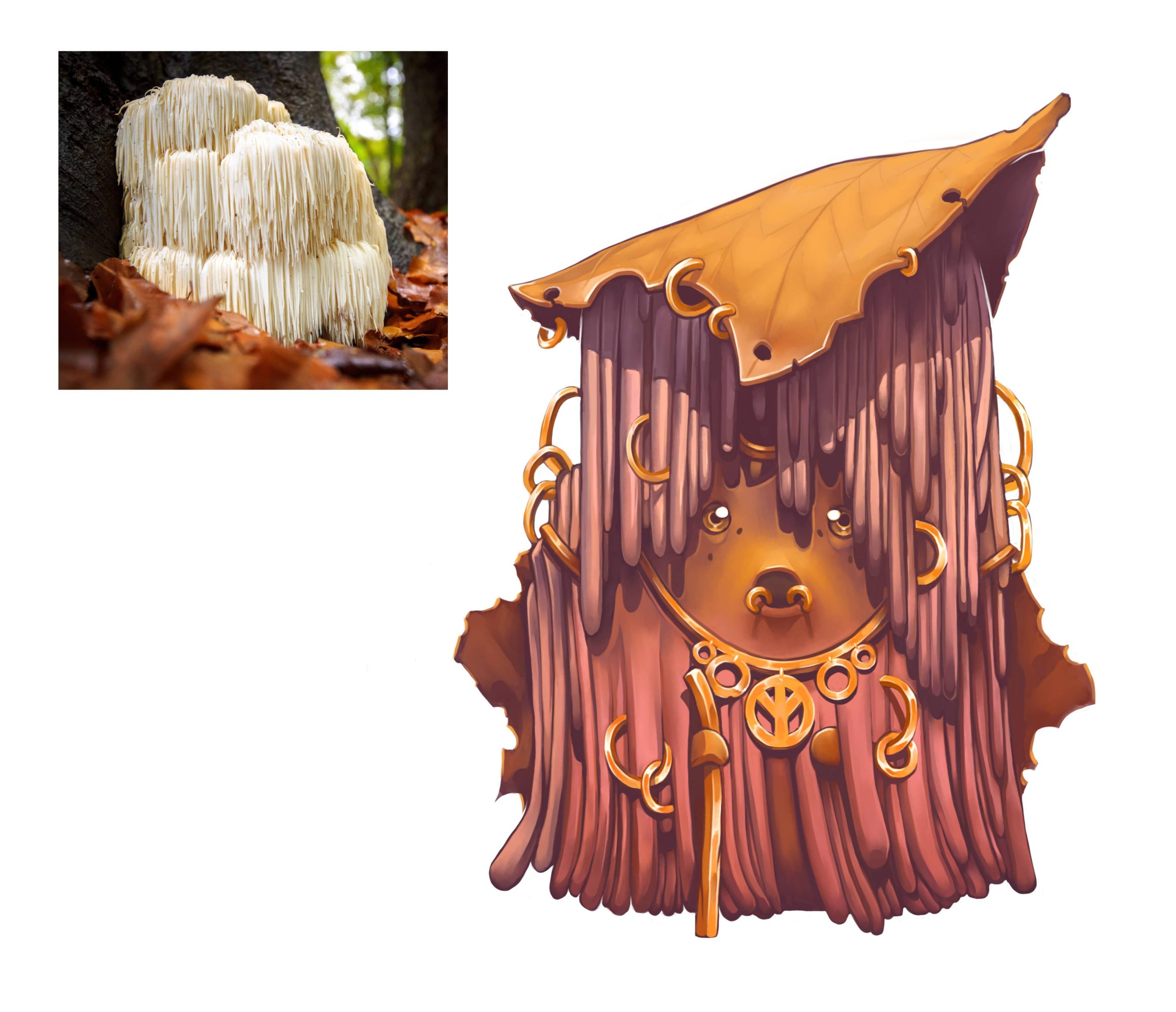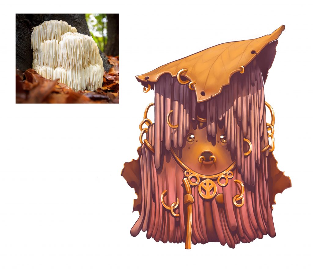 Conception et élaboration de personnages hybrides, inspirés de plusieurs espèces de champignon.